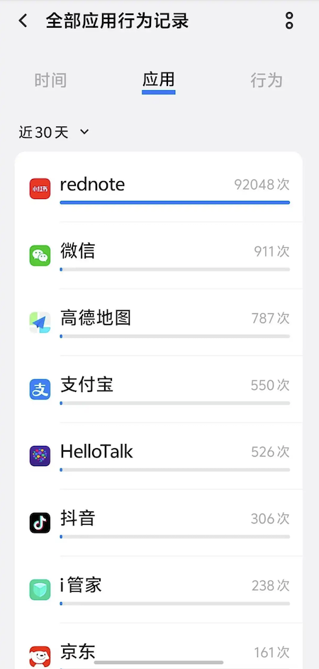 一位用户小V(化名)告诉九派财经,她是头一天偶然刷到有人吐槽小红书后台访问量过高,出于好奇点开安卓手机的隐私项查看,发现自己的数据同样惊人:近30天内小红书应用访问总量高达9.2万次,遥遥领先于第二位的微信,只有911次。全部应用行为记录显示,其中的地址访问最为频繁,高达7.1万次,仅3月25日当天就访问了2148次。