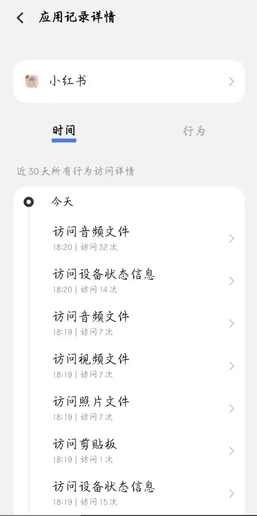另一用户杏儿(化名)也向记者表示,其应用记录显示近30天小红书的访问记录近5万次,其中定位访问占4.6万次。在访问详情里,仅3月25日18:19这短短一分钟,小红书还分别访问了她的设备状态15次、音频文件7次、视频文件7次、照片文件7次、剪贴板1次。