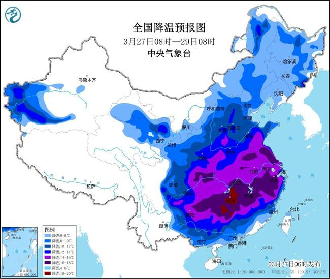 预计,3月27日8时至29日8时,新疆南疆盆地、西北地区中东部、内蒙古中东部、华北西部、黄淮、江淮、江汉、江南、华南大部以及四川东北部、重庆东北部、贵州东部、黑龙江中东部、吉林东部等地将降温8℃~10℃,