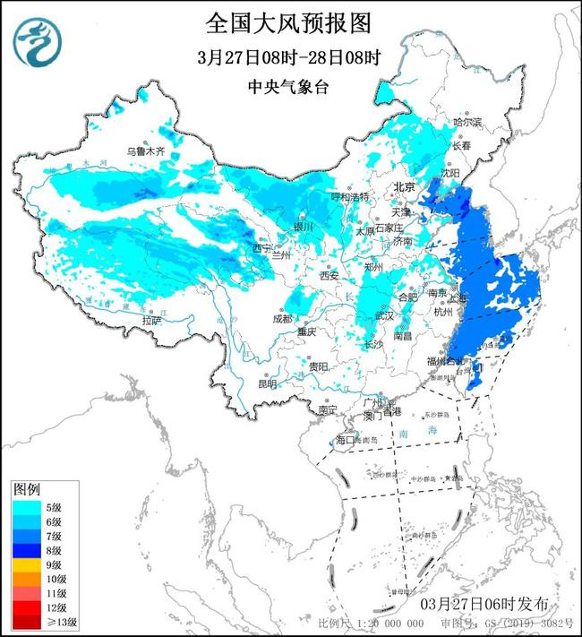 预计,3月27日8时至28日8时,新疆北疆东部和南疆盆地、西藏中北部、青海大部、内蒙古大部、甘肃北部和东部、宁夏大部、陕西北部、山西中北部、河北、北京、天津、辽宁中西部和辽东半岛、吉林西部、山东半岛、河南、江苏、安徽、湖北中东部、湖南中北部、江西北部以及四川东北部等地的部分地区有5~6级风、阵风7~9级;渤海、渤海海峡、黄海大部海域、东海大部海域将有7~8级、阵风9~10级的大风。