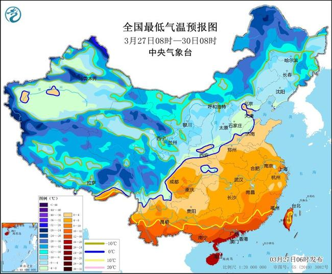 过程最低气温将出现在3月29日夜间至30日凌晨,最低温度0℃线将位于华北南部至秦岭一带。