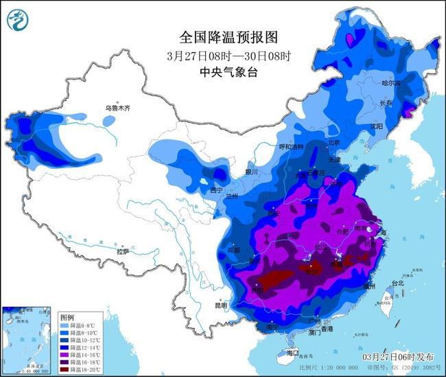 受寒潮影响,预计,3月27日8时至3月30日8时,新疆南疆盆地、西北地区中东部、内蒙古中东部、黑龙江大部、吉林东部、辽宁东部和西南部、华北、黄淮、江淮、江汉、江南、华南大部以及西南地区东部等地将先后降温8~14℃。