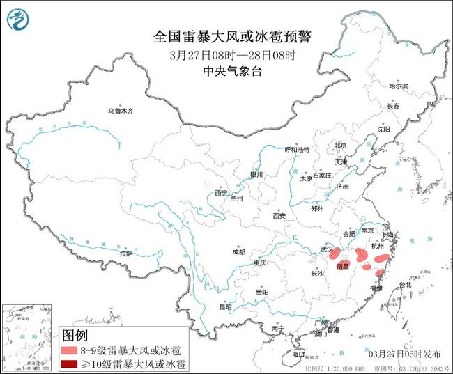 预计3月27日8时至28日8时,安徽南部、湖北东部、江西中北部、浙江中南部、福建北部等地的部分地区将有8级以上雷暴大风或冰雹天气;安徽南部、湖北东部、江西中北部、浙江中南部、福建中北部等地的部分地区将有小时雨量大于20毫米的短时强降水天气。