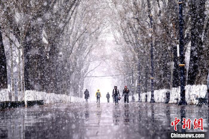 3月26日,哈尔滨市迎来降雪天气,图为行人冒雪出行。 赵宇航 摄