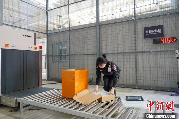 机场工作人员对出口货物进行安检。王婷婷 摄