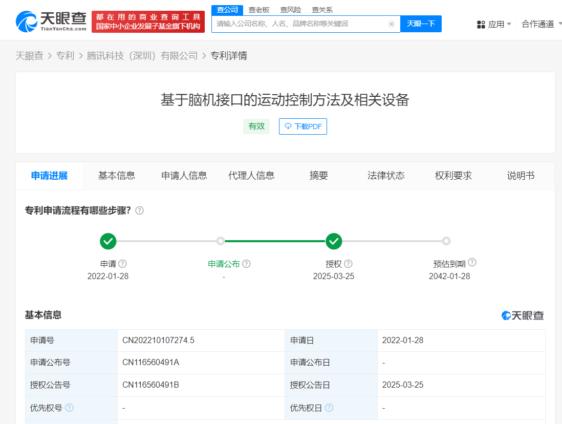 天眼查财产线索信息显示,近日,腾讯科技(深圳)有限公司申请的“基于脑机接口的运动控制方法及相关设备”专利获授权。