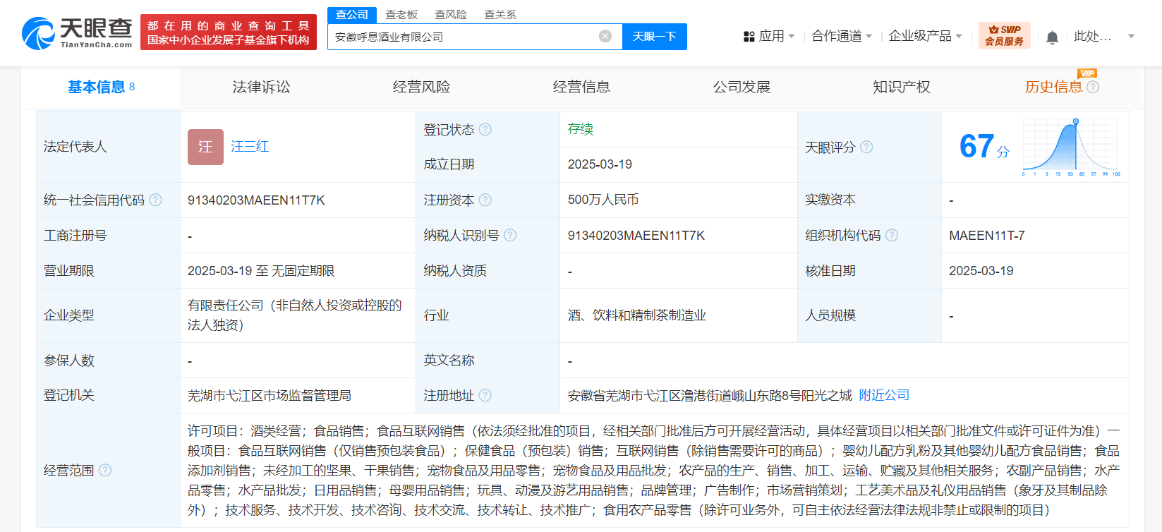 天眼查App显示,近日,安徽三只松鼠生物科技有限公司、安徽呼息酒业有限公司成立,法定代表人均为汪三红,注册资本均为500万人民币,前者经营范围含生物化工产品技术研发,日用品销售,日用杂品销售,广告设计、代理等,后者经营范围含酒类经营、食品销售、食品互联网销售等。股东信息显示,上述两公司均由三只松鼠(300783)全资持股。