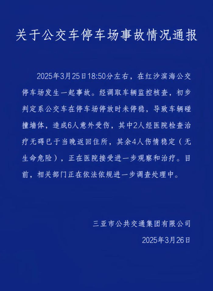 三亚公交集团3月26日通报,3月25日18:50分左右,在红沙滨海公交停车场发生一起事故。经调取车辆监控核查,初步判定系公交车在停车场停放时未停稳,导致车辆碰撞墙体,造成6人意外受伤,其中2人经医院检查治疗无碍已于当晚返回住所,其余4人伤情稳定(无生命危险),正在医院接受进一步观察和治疗。目前,相关部门正在依法依规进一步调查处理中。
