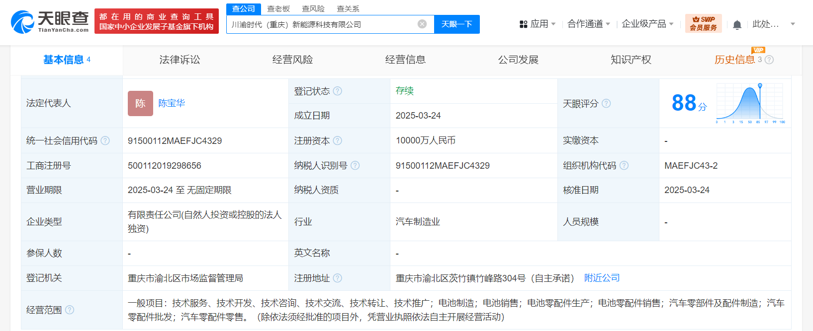 天眼查App显示,近日,川渝时代(重庆)新能源科技有限公司成立,法定代表人为陈宝华,注册资本1亿人民币,经营范围含电池制造、电池销售、电池零配件生产、电池零配件销售、汽车零部件及配件制造、汽车零配件批发、汽车零配件零售等。股东信息显示,该公司由宁德时代(300750)全资持股。