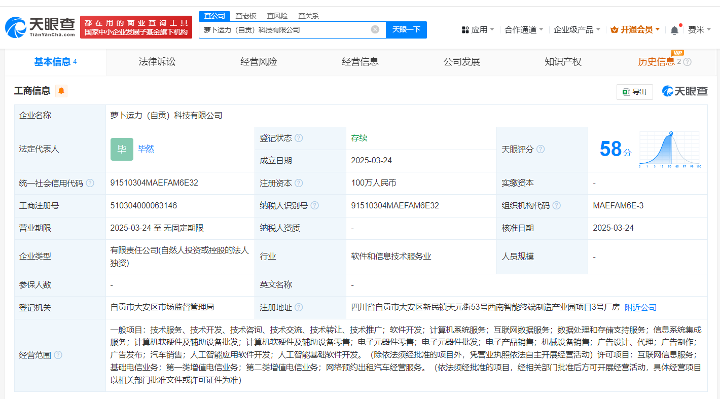 天眼查App显示,近日,萝卜运力(自贡)科技有限公司成立,法定代表人为毕然,注册资本100万人民币,经营范围包括软件开发、计算机系统服务、互联网数据服务、数据处理和存储支持服务、人工智能应用软件开发、人工智能基础软件开发等,由萝卜快跑关联公司萝卜运力(北京)科技有限公司全资持股。