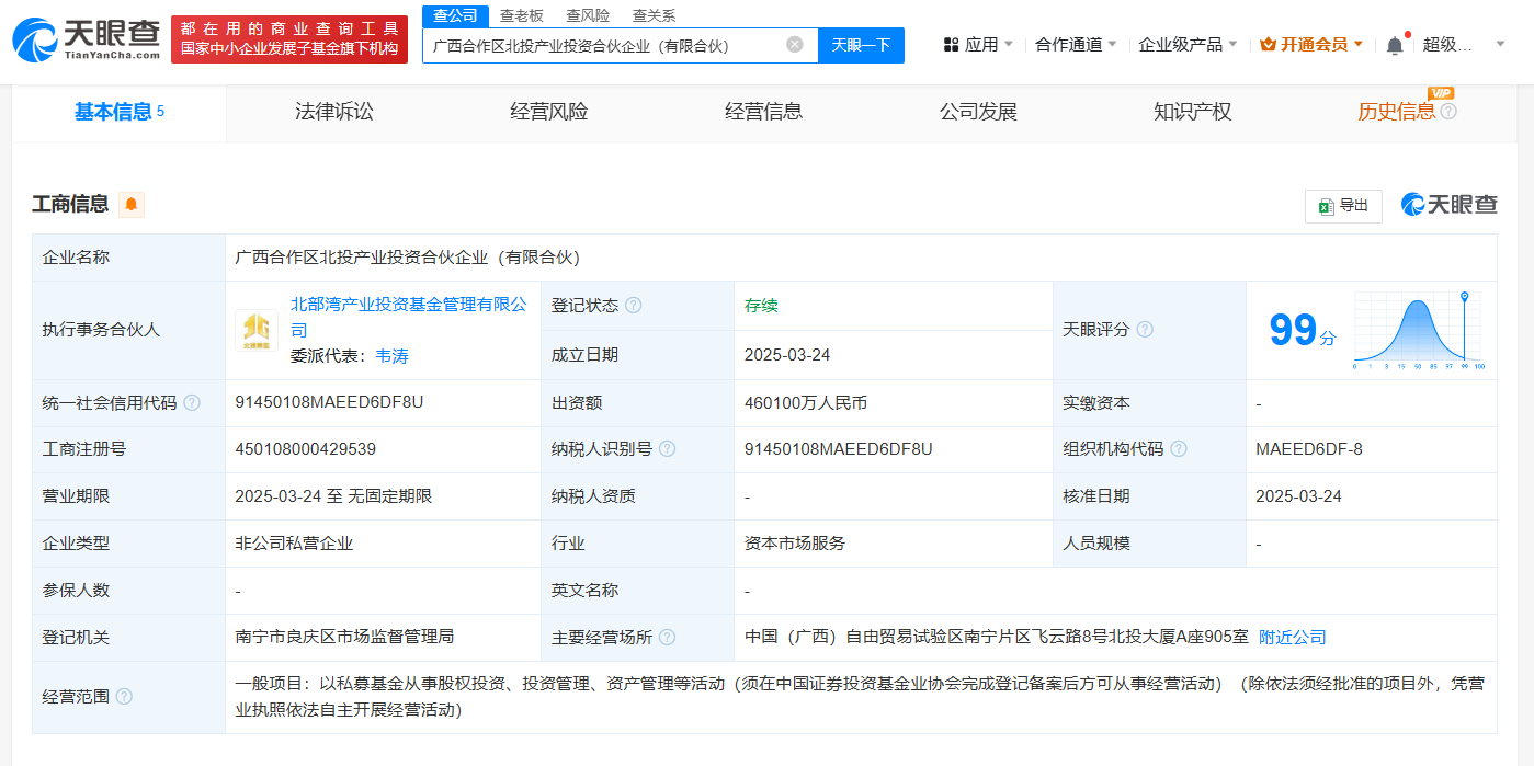 天眼查App显示,近日,广西合作区北投产业投资合伙企业(有限合伙)成立,执行事务合伙人为北部湾产业投资基金管理有限公司,出资额46.01亿人民币,经营范围包括以私募基金从事股权投资、投资管理、资产管理等活动。合伙人信息显示,该企业由广西投资引导基金有限责任公司、广西北部湾投资集团有限公司及旗下北部湾产业投资基金管理有限公司共同出资。