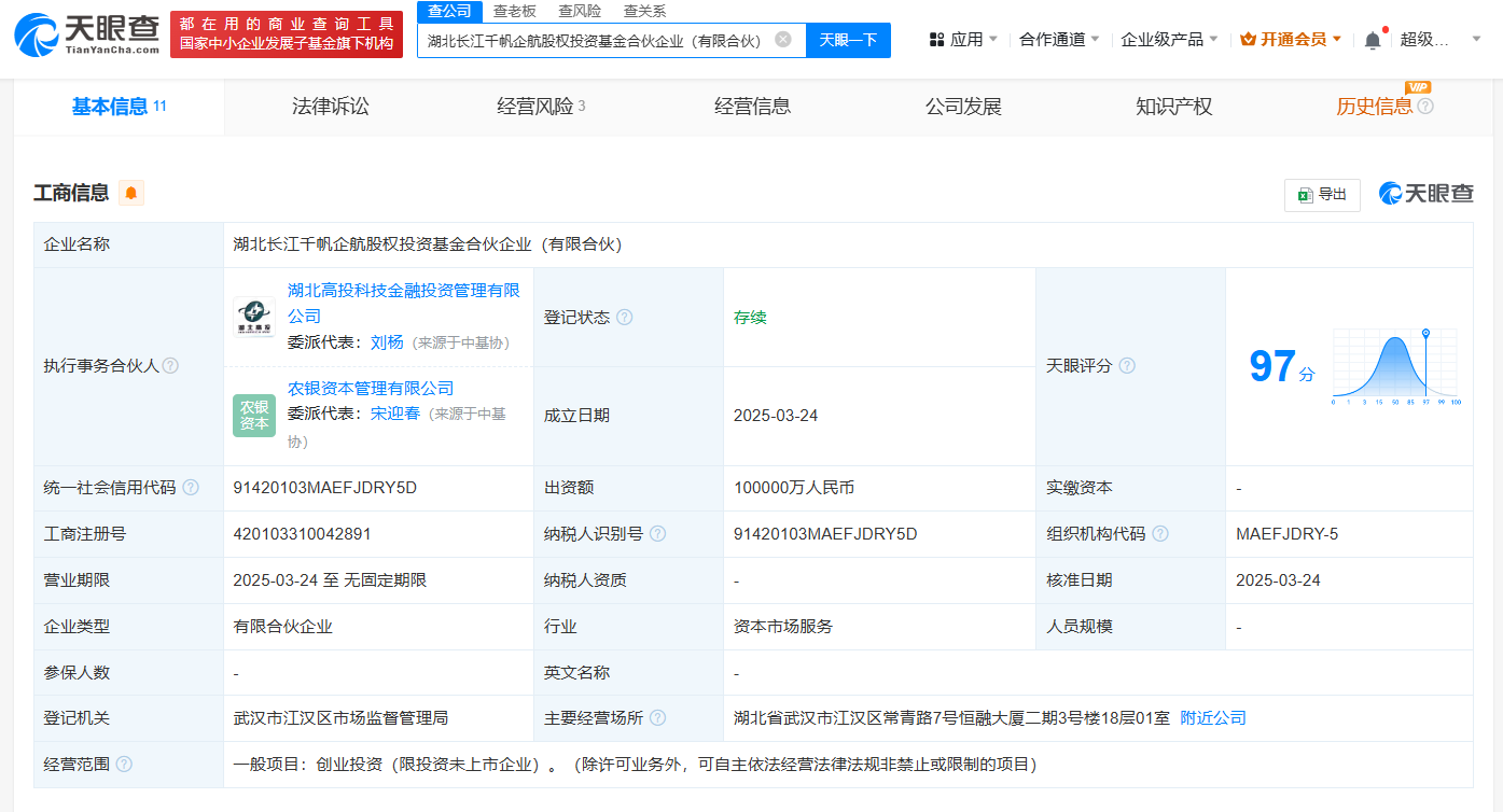 天眼查App显示,近日,湖北长江千帆企航股权投资基金合伙企业(有限合伙)成立,执行事务合伙人为湖北高投科技金融投资管理有限公司、农银资本管理有限公司,出资额10亿人民币,经营范围为创业投资。合伙人信息显示,该基金由农银金融资产投资有限公司、湖北长江产业投资基金有限公司、湖北省投资引导基金有限公司等共同出资。