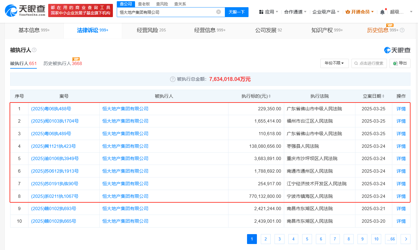 天眼风险信息显示,恒大地产集团有限公司现存650余条被执行人信息,被执行总金额超763亿元。此外,该公司还存在多条限制消费令、失信被执行人(老赖)及终本案件信息。