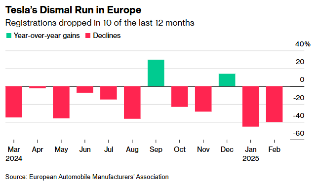 欧洲汽车制造商协会周二(3月25日)发布的最新数据显示,特斯拉2月在欧盟、欧洲自由贸易联盟和英国市场的新车注册量连续第二个月猛降四成,这也是这家美国电动汽车制造商在欧销量在过去12个月中第10个月出现下滑。