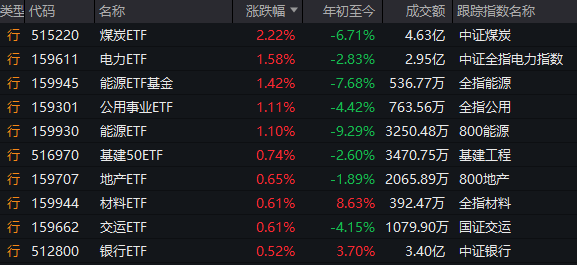 当然,电力板块本身也有一定红利属性,因此电力ETF又与煤炭ETF、红利国企ETF、银行ETF等同日走强。