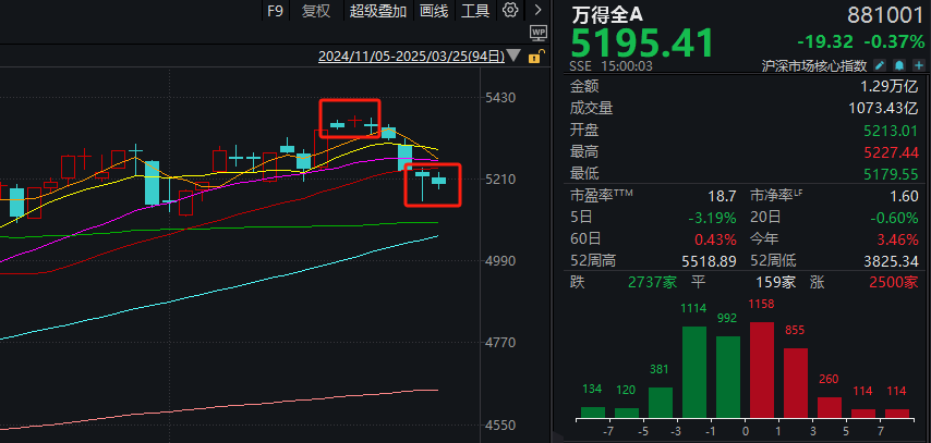 以万得全A为例,上周前半周在5日线上连收3颗十字星的大盘,如今回落到中期趋势线下方。