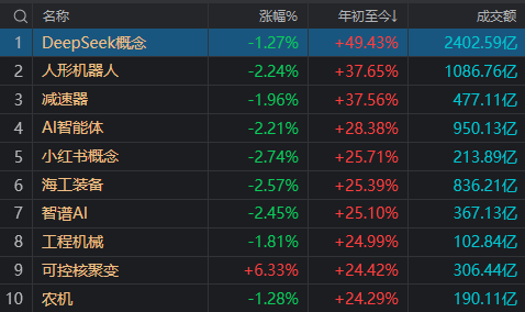 但从板块成交额来看,这一题材承接的资金量,目前还远不如今天延续跌势的DeepSeek、人形机器人、减速器等高位题材,甚至暂时不如前两天的海工装备。
