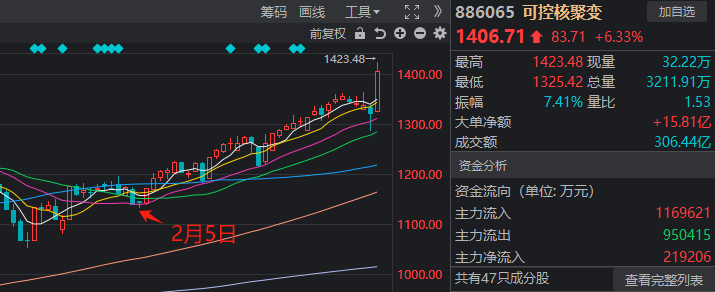 数据显示,可控核聚变概念今日领涨市场,录得了至少是今年的最大单日涨幅。日K图来看,2月5日至今,该板块小步碎阳的上升趋势比较明显。