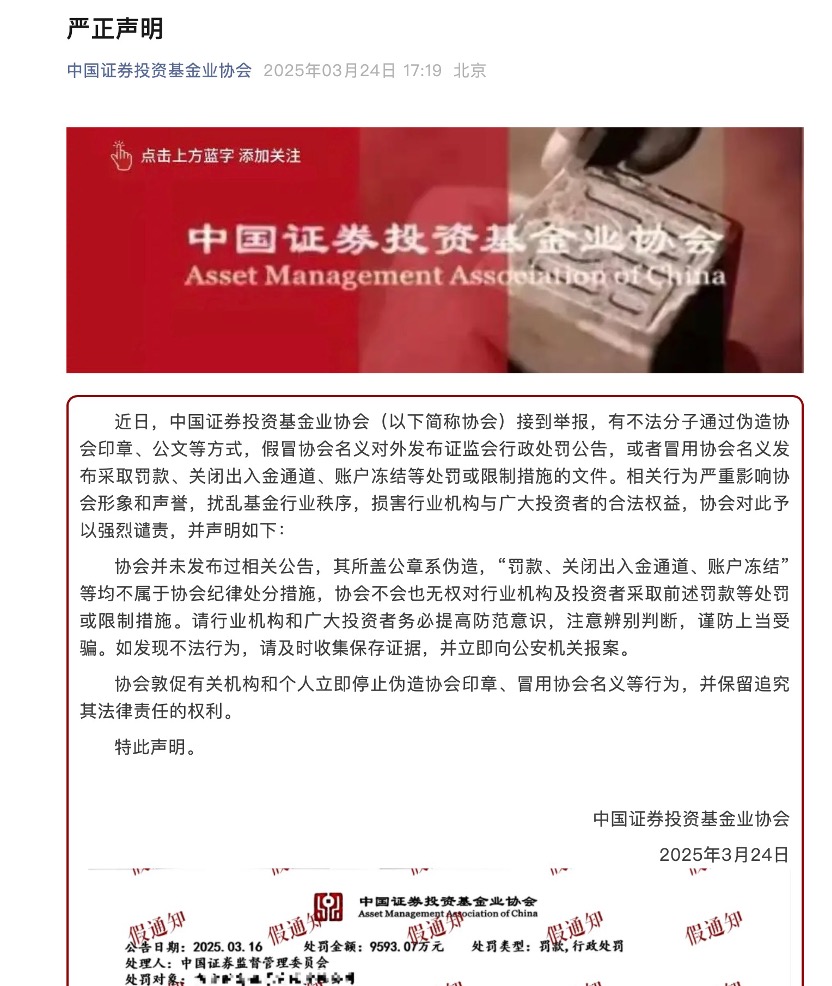 3月24日,中基协公告称,接到举报,有不法分子通过伪造协会印章、公文等方式,假冒协会名义对外发布证监会行政处罚公告,或者冒用协会名义发布采取罚款、关闭出入金通道、账户冻结等处罚或限制措施的文件。