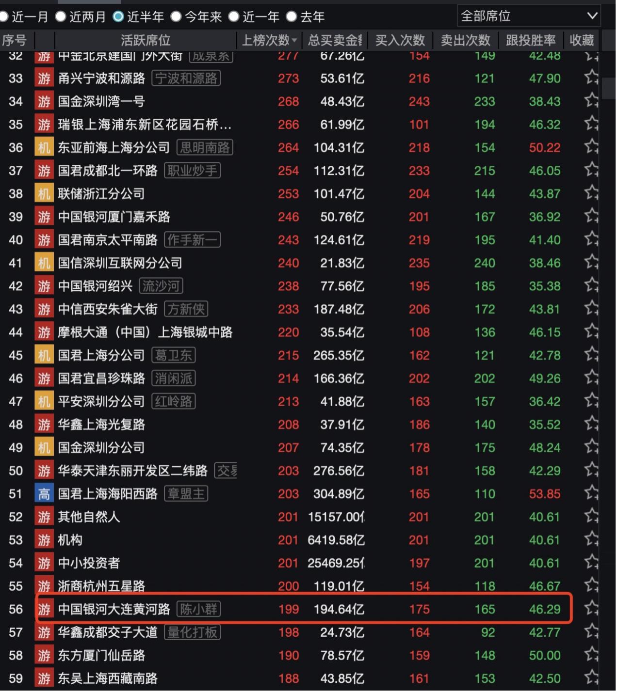 陈小群的常用席位为中国银河大连金马路营业部、中国银河大连黄河路营业部,尤其是大连黄河路席位,为龙虎榜常客,以最近半年来看,中国银河大连黄河路上榜次数为199次,总买入金额高达194.64亿元,在活跃席位中排第56名。