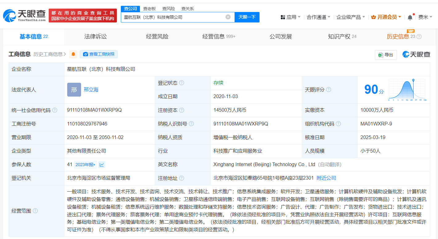 天眼查App显示,近日,星航互联(北京)科技有限公司发生工商变更,新增国调二期协同发展基金股份有限公司为股东,注册资本由1亿人民币增至1.45亿人民币,同时多位高管发生变更。