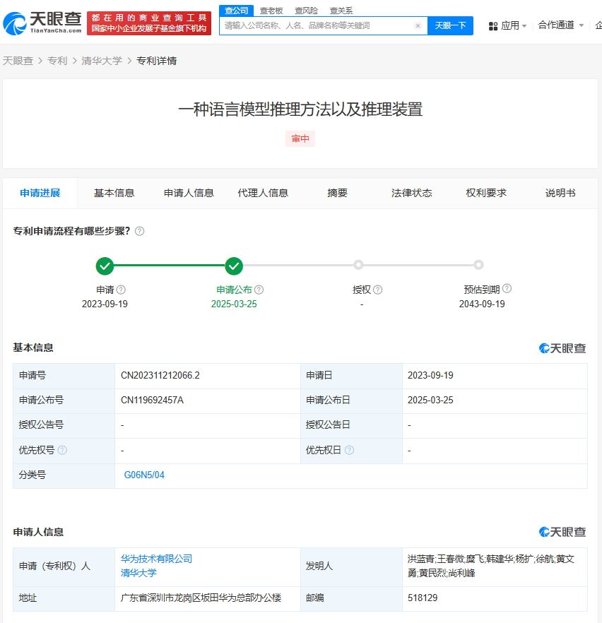 天眼查财产线索信息显示,3月25日,华为技术有限公司、清华大学申请的“一种语言模型推理方法以及推理装置”专利公布。