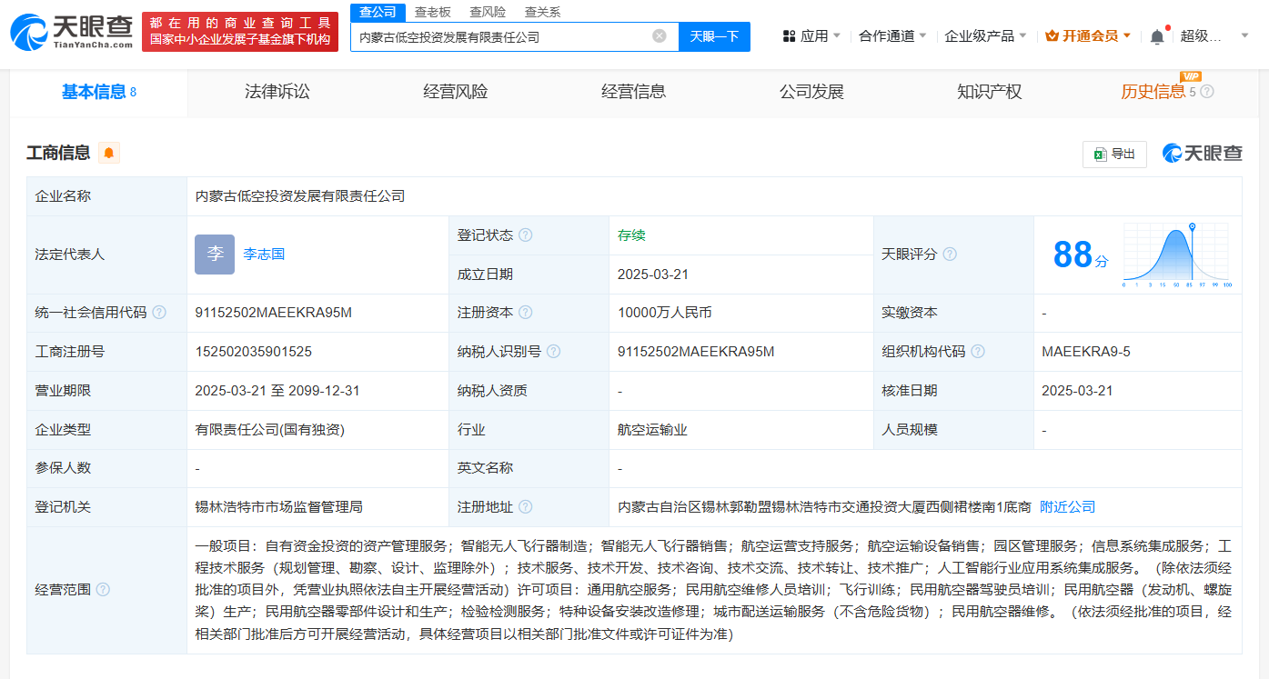 天眼查App显示,近日,内蒙古低空投资发展有限责任公司成立,法定代表人为李志国,注册资本1亿人民币,经营范围包括自有资金投资的资产管理服务、智能无人飞行器制造、智能无人飞行器销售、航空运营支持服务等。股东信息显示,该公司由锡林郭勒盟财政局(锡林郭勒盟国有资产监督管理委员会)全资持股。