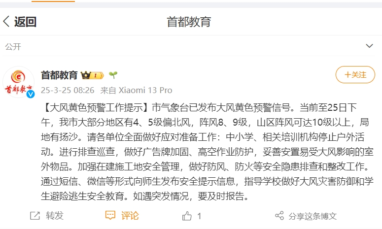 北京市教委官方微博25日发布大风黄色预警提示:3月25日,北京市气象台已发布大风黄色预警信号。当前至25日下午,北京市大部分地区有4、5级偏北风,阵风8、9级,山区阵风可达10级以上,局地有扬沙。