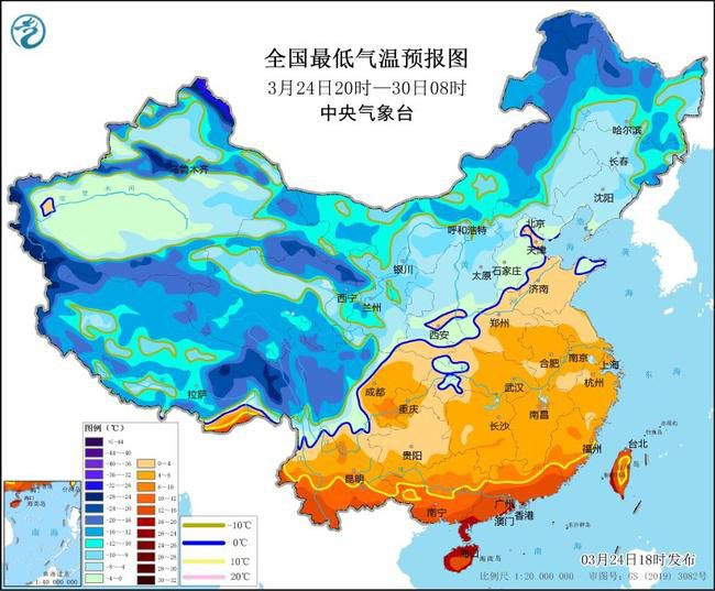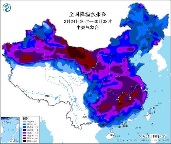 受寒潮影响,预计,3月24日20时至3月30日08时,新疆、西北地区大部、内蒙古、东北地区、华北地区、黄淮、江南、华南大部以及西南地区东部等地将先后降温8~14℃,其中,内蒙古西部、新疆北疆东部和南疆盆地、甘肃大部、宁夏大部、黄淮西部、江淮中西部、江汉大部、江南中北部、贵州中东部等地部分地区降温可达16~18℃,局地降温超过20℃。过程最低气温将出现在3月29日夜间至30日凌晨,最低温度0℃线将位于华北南部至秦岭一带。