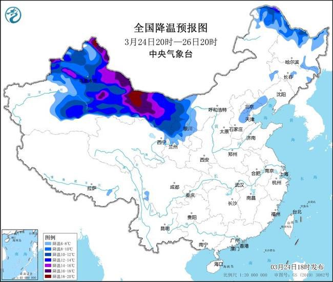 预计,3月24日20时至3月26日20时,新疆北部和南疆盆地、内蒙古西部、甘肃中西部、宁夏北部、黑龙江西北部等地将降温8~10℃,其中,内蒙古西北部、新疆沿天山地区、甘肃河西等地部分地区降温可达12~16℃,局地超过18℃。