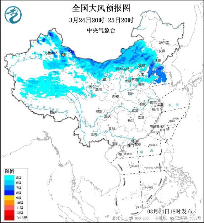 预计,3月24日20时至25日20时,新疆北部、内蒙古中西部、辽宁中西部、西藏北部、青海西部、河北北部、北京大部、天津大部、山东北部和半岛地区等地有5~6级风、阵风7~9级,其中,新疆北部局地有7~9级风、阵风10~11级;渤海、渤海海峡、黄海北部和中部海域将有7~8级风、阵风9级。