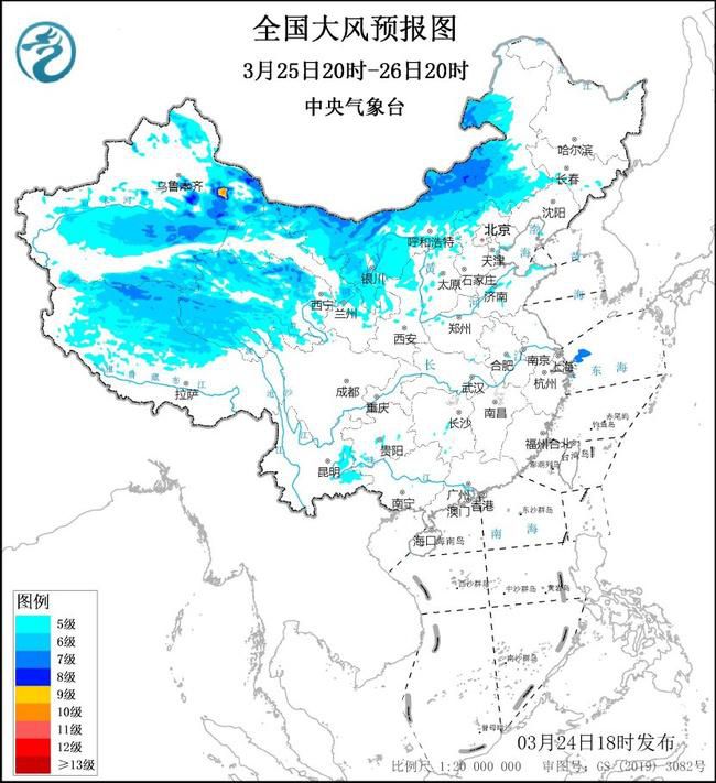 预计,3月25日20时至26日20时,新疆北疆东部和南疆盆地、内蒙古大部、甘肃西部、宁夏大部、陕西北部、西藏中西部、青海中西部、河北北部等地有5~6级风、阵风7~9级,其中,新疆北疆东部局地有7~8级风、阵风9~10级。