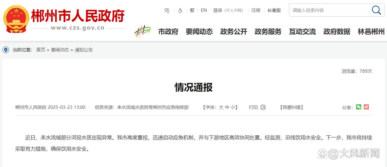 3月23日,郴州市(地级市)政府官网通报称,经检测,沿线饮用水安全。下一步将持续采取有力措施,确保饮用水安全。