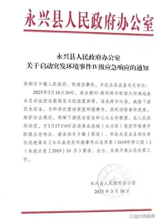 早在3月16日,郴州市永兴县政府办发布通知称,3月16日20时,耒水郴州-衡阳跨市断面大河滩地表水自动监控站数据显示铊浓度异常。为科学处置该突发环境事件,及时消除事件危害,保障下游饮水安全和公众生命健康,永兴县政府决定于3月17日0时启动耒水流域(永兴段)突发环境事件Ⅳ级应急响应。