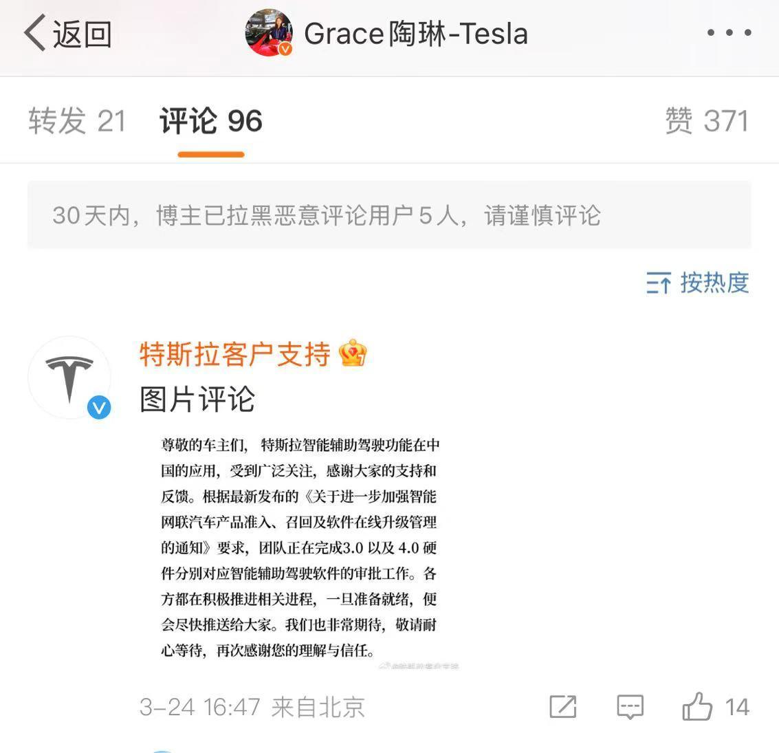 3月24日,特斯拉客户支持官微在特斯拉公司副总裁陶琳的微博评论区回应了“暂停FSD推送”的消息: