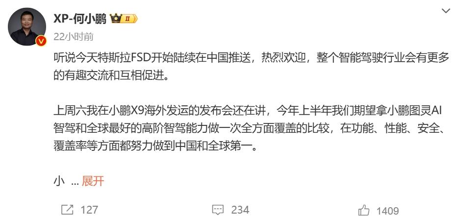 2月25日晚,小鹏汽车董事长何小鹏在微博发文表示:“听说今天特斯拉FSD开始陆续在中国推送,热烈欢迎,整个智能驾驶行业会有更多的有趣交流和互相促进。