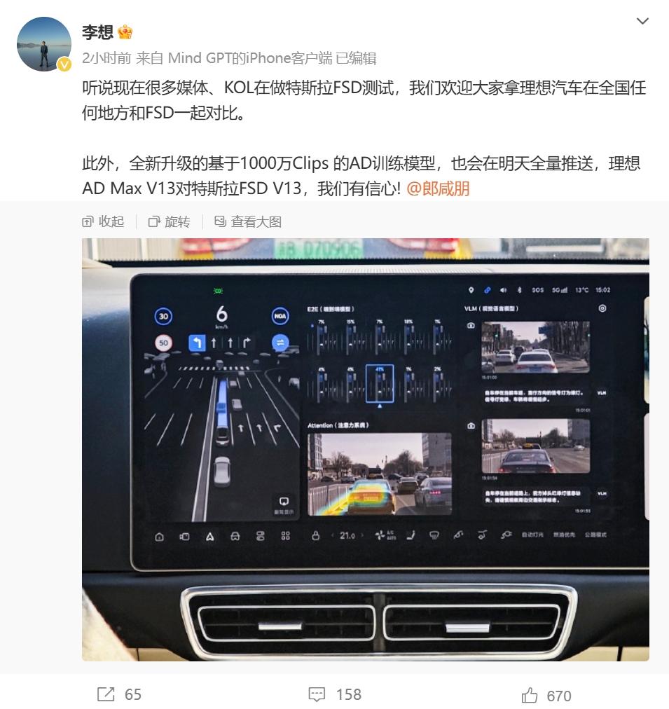 同时,李想还透露,理想全新升级的基于1000万Clips 的AD训练模型,也会在明天全量推送,理想AD Max V13对特斯拉FSD V13,我们有信心!