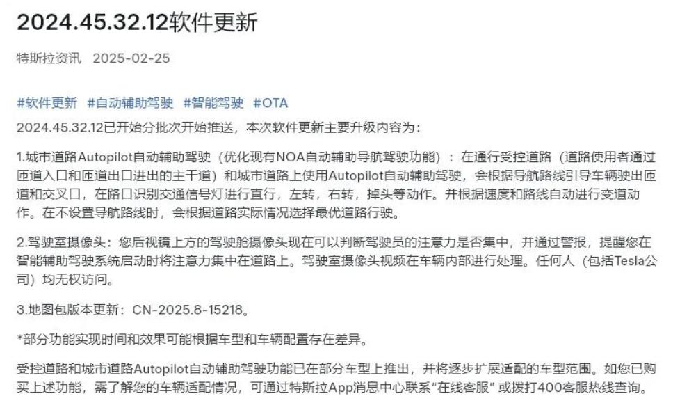 2月25日,特斯拉宣布已开始分批次向中国客户推送FSD功能,软件版本为2024.45.32.12。软件升级后,部分特斯拉车主将可使用城市NOA(领航辅助驾驶),系统将具备识别交通信号灯、自主变道、识别交叉路口等功能。