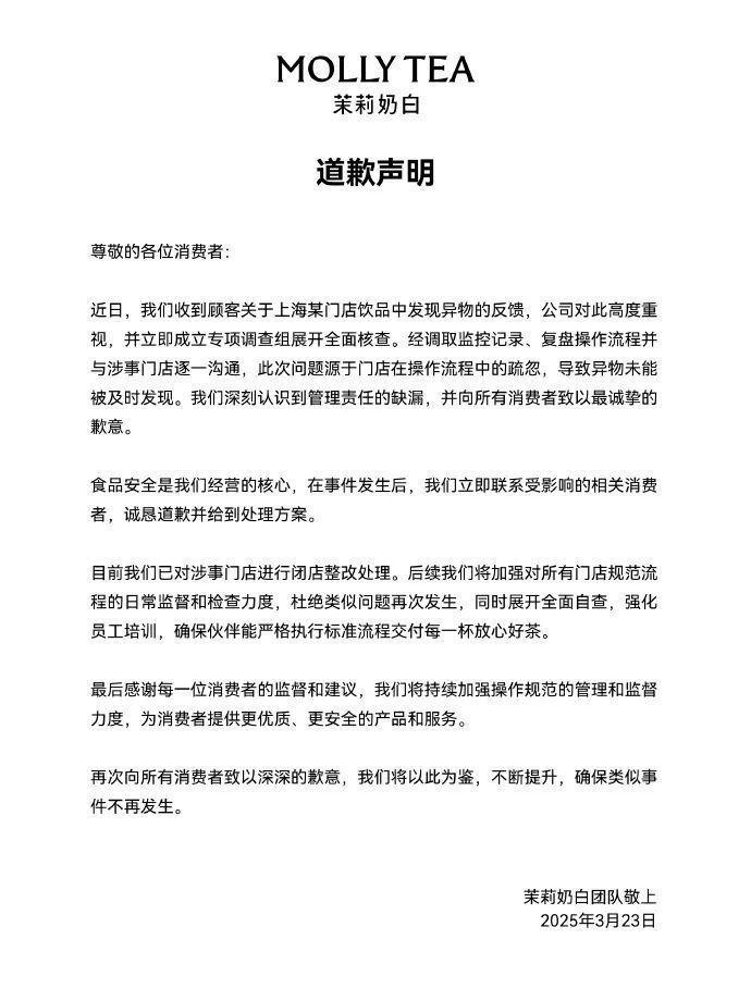 3月23日晚,@茉莉奶白MollyTea 发布道歉声明,全文如下: