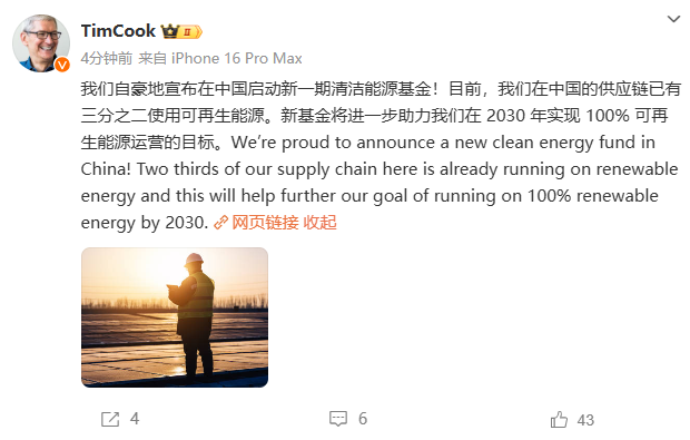 3月24日,苹果CEO库克在微博发文称,“我们自豪地宣布在中国启动新一期清洁能源基金!目前,我们在中国的供应链已有三分之二使用可再生能源。新基金将进一步助力我们在2030年实现100%可再生能源运营的目标。”该笔新的投资基金高达7.2亿元人民币,该基金的目标是每年为中国电网新增约55万兆瓦时的风能和太阳能发电能力,这一数字将随着更多投资者的加入而增长。