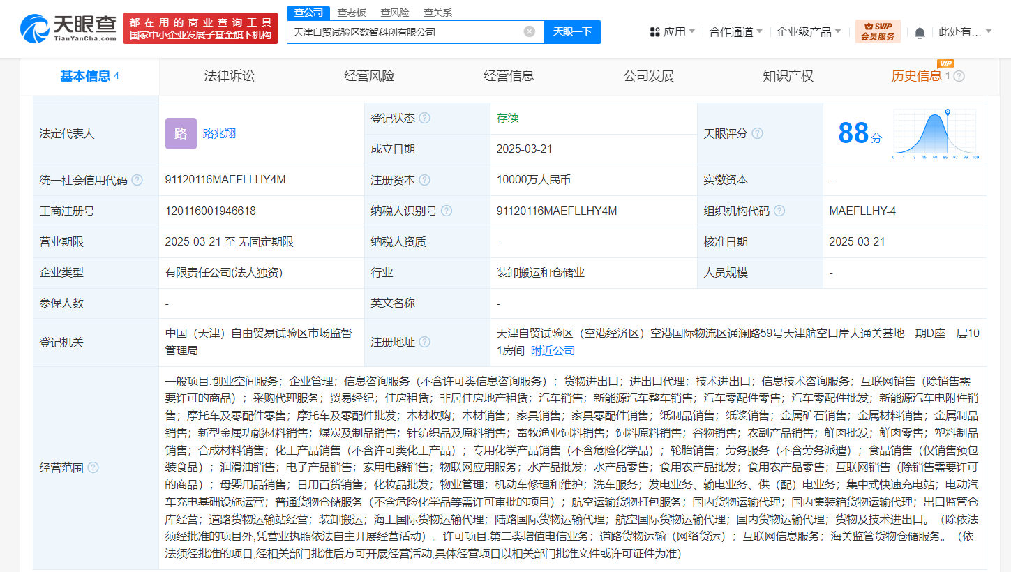天眼查App显示,近日,天津自贸试验区数智科创有限公司成立,法定代表人为路兆翔,注册资本1亿人民币,经营范围含创业空间服务、企业管理、信息咨询服务、信息技术咨询服务、互联网销售、新能源汽车整车销售、新能源汽车电附件销售、金属矿石销售、新型金属功能材料销售、煤炭及制品销售等。股东信息显示,该公司由天津自贸试验区新兴科技产业有限公司全资持股。