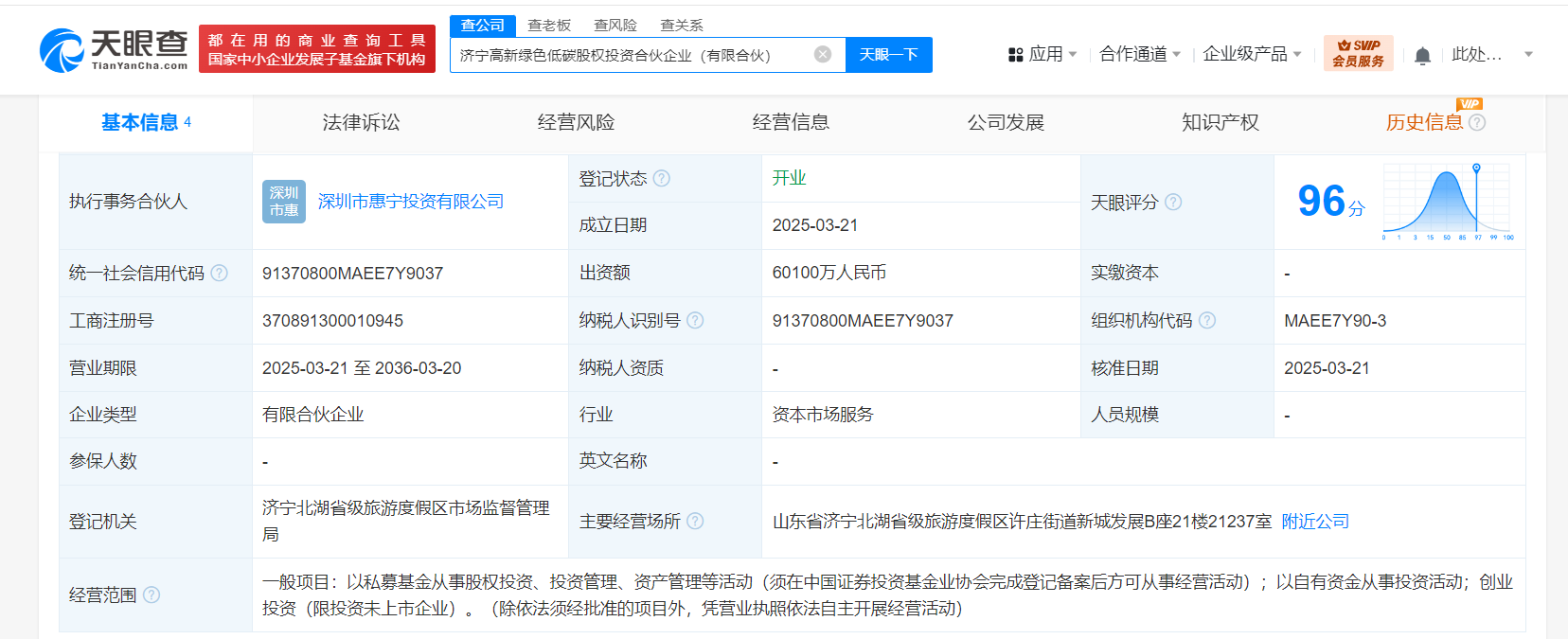 天眼查App显示,近日,济宁高新绿色低碳股权投资合伙企业(有限合伙)成立,执行事务合伙人为深圳市惠宁投资有限公司,出资额6.01亿人民币,经营范围为以私募基金从事股权投资、投资管理、资产管理等活动,以自有资金从事投资活动,创业投资。合伙人信息显示,该企业由济宁高新产业投资集团有限公司、深圳市惠宁投资有限公司共同出资。