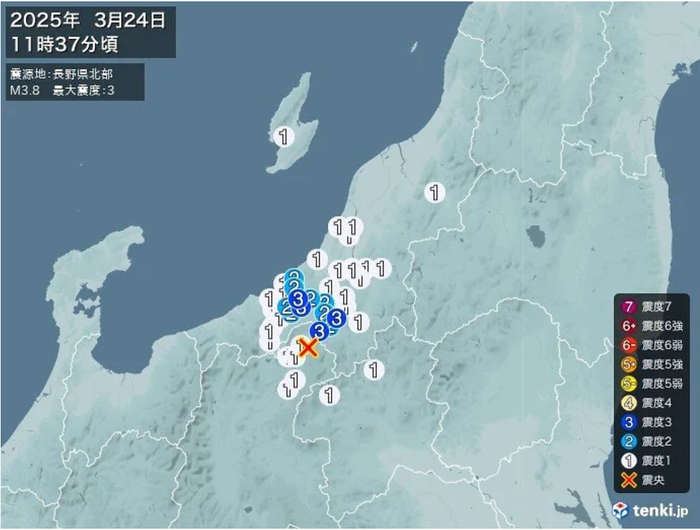 据日本气象协会消息,当地时间3月24日上午11时37分左右,日本长野县北部发生3.8级地震,震源深度10公里。新潟县和长野县最大震度达3级。此次地震没有引发海啸的风险。