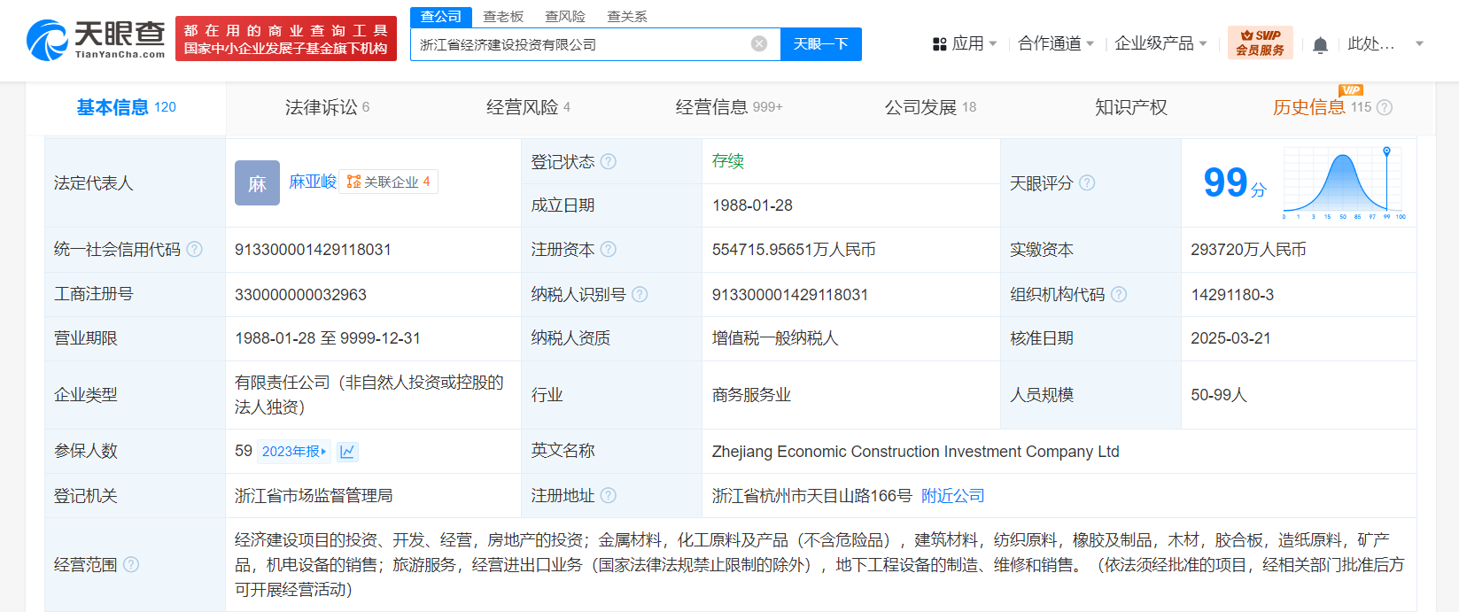 该公司成立于1988年1月,法定代表人为麻亚峻,经营范围含经济建设项目的投资、开发、经营,房地产的投资等。股东信息显示,该公司由浙江省交通投资集团有限公司全资持股。