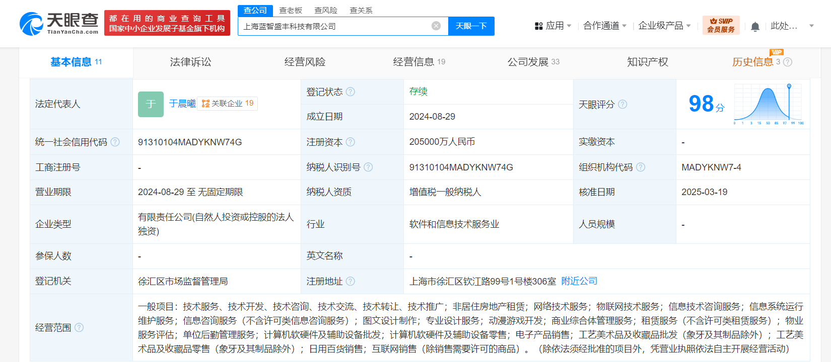 天眼查App显示,近日,上海蓝智盛丰科技有限公司发生工商变更,注册资本由1.5亿人民币增至20.5亿人民币,增幅约1267%。