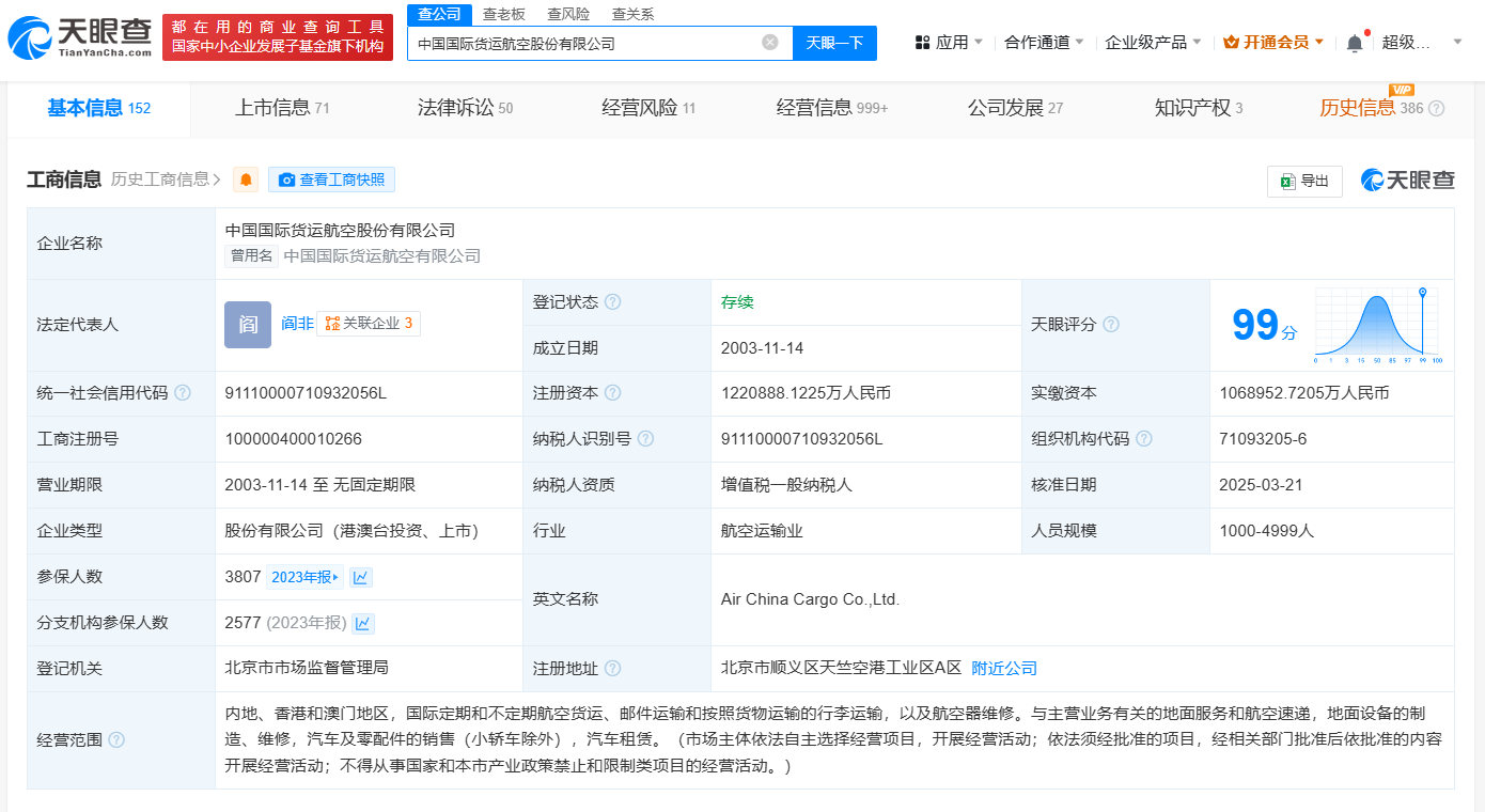 天眼查App显示,近日,中国国际货运航空股份有限公司发生工商变更,注册资本由约106.9亿人民币增至约122亿人民币。
