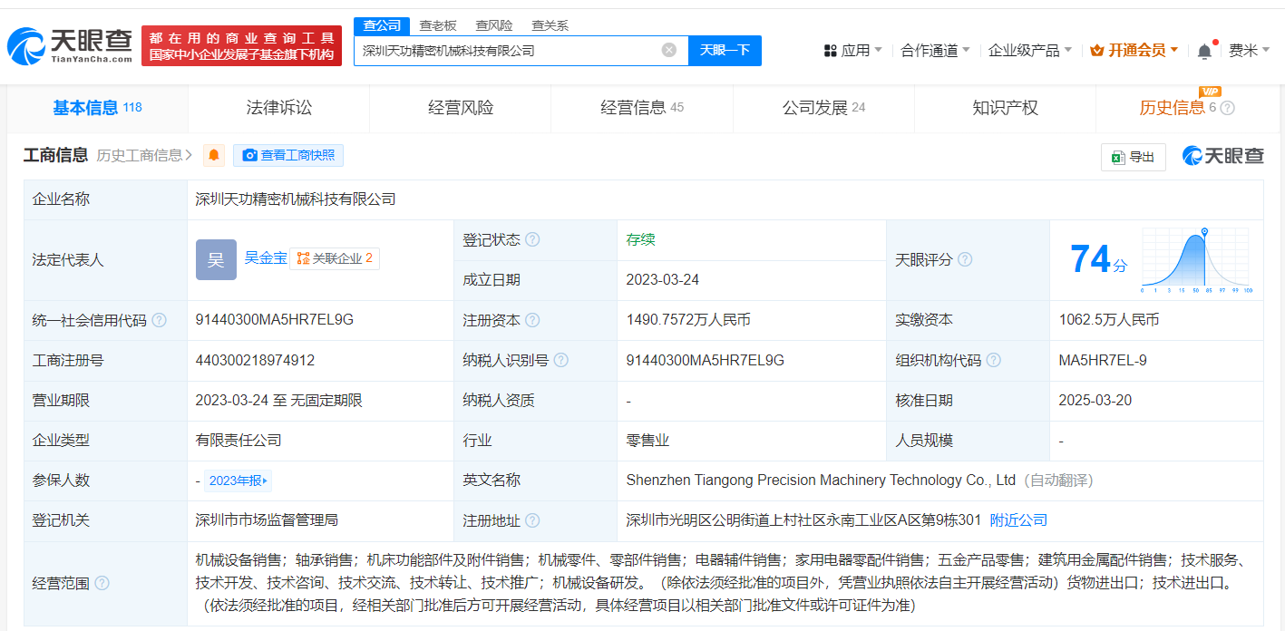 该公司成立于2023年3月,法定代表人为吴金宝,经营范围包括机械设备销售、轴承销售、机床功能部件及附件销售等,现由无锡天之工精密科技合伙企业(有限合伙)、广州市正轩前瞻睿远创业投资合伙企业(有限合伙)等共同持股。