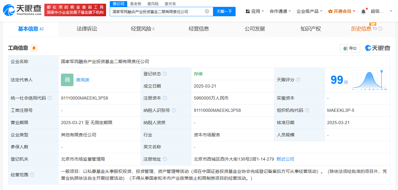 天眼查App显示,近日,国家军民融合产业投资基金二期有限责任公司成立,法定代表人为曲克波,注册资本596亿人民币,经营范围包括以私募基金从事股权投资、投资管理、资产管理等活动。股东信息显示,该公司由中华人民共和国财政部、北京金融街资本运营集团有限公司、中国航空工业集团有限公司、北京市政府投资引导基金(有限合伙)等共同持股。
