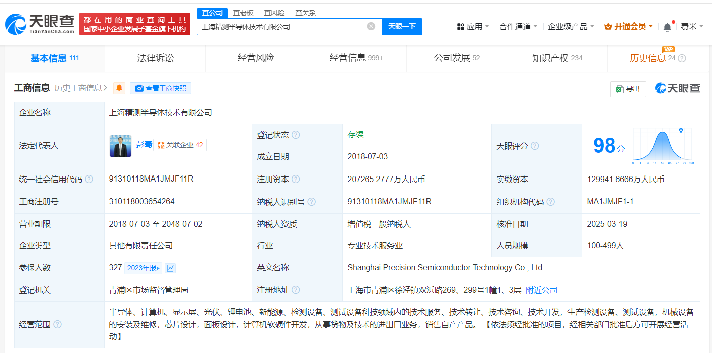 上海精测半导体技术有限公司成立于2018年7月,法定代表人为彭骞,经营范围包括机械设备的安装及维修、芯片设计、面板设计等,现由精测电子(300567)、彭骞等及上述新增股东共同持股。