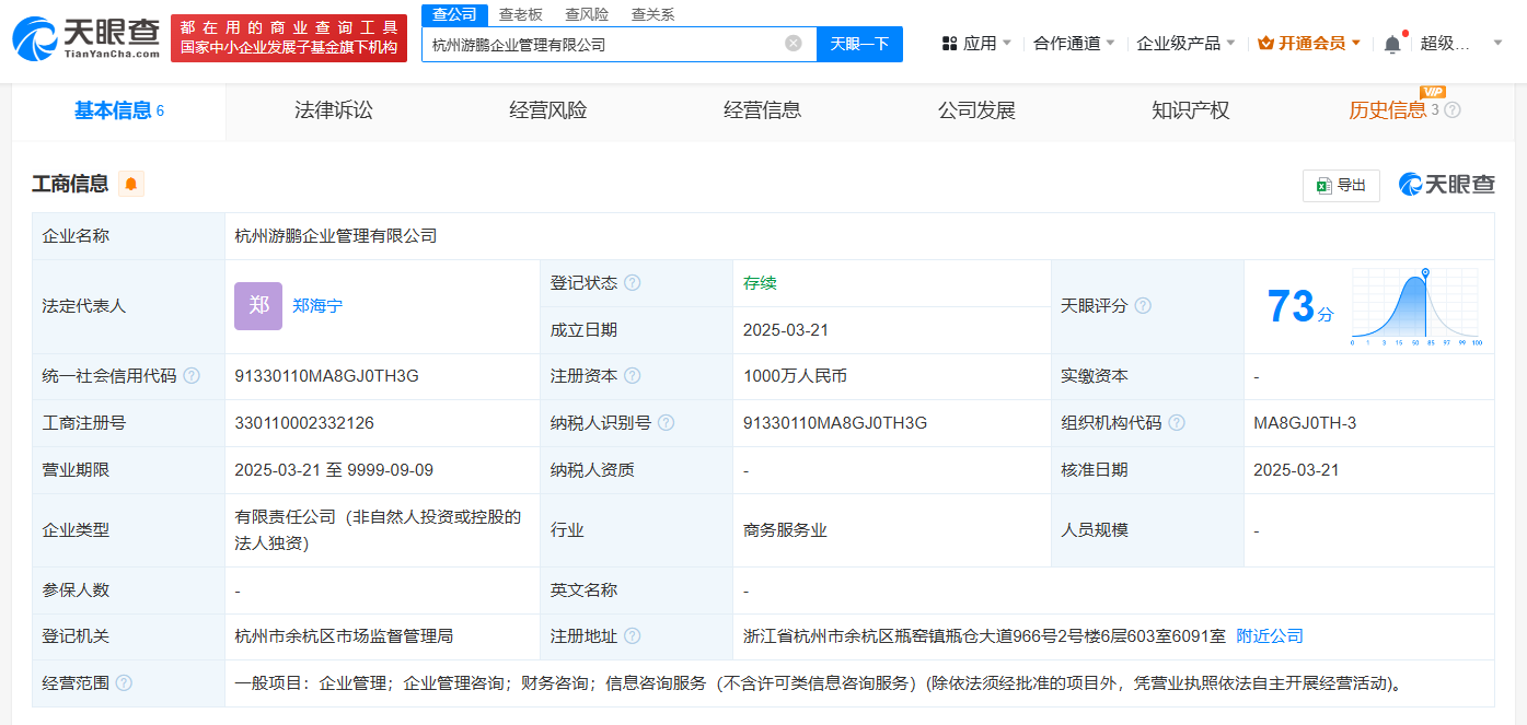 天眼查App显示,近日,杭州游鹏企业管理有限公司成立,法定代表人为郑海宁,注册资本1000万人民币,经营范围包括企业管理、企业管理咨询、财务咨询、信息咨询服务。股东信息显示,该公司由浙江菜鸟供应链管理有限公司全资持股。